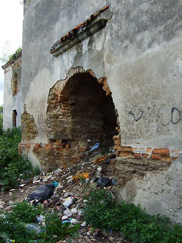2011 р. Портал північного рамена трансепту. Вигляд з північного заходуРозмір зображення: 600:800 піксел І тут, як і в замку, бачимо залишки скарбу князів Заславських. 26 червня 2011 р. Фото М.І.Жарких. |