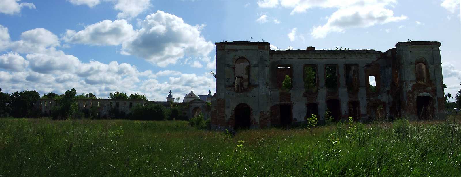 2011 р. Загальний вигляд із заходу Розмір зображення: 1600:616 піксел 26 червня 2011 р. Фото М.І.Жарких. Вкладені елементи Західний фасад дворика з аркадою Західний фасад палацу