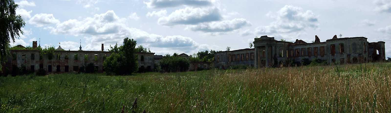 2011 р. Панорама з північного заходу Розмір зображення: 1600:462 піксел 26 червня 2011 р. Фото М.І.Жарких. Вкладені елементи Північний корпус Дворик з аркадою і східна частина палацу Західна частина палацу
