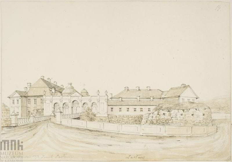 Pałac Sanguszków. Widok mostu, bramy i fragmentu zabudowań od strony wjazdu na dziedziniec pałacowy. Napis: Zamek Zasławia; Zasław; napis na podkładzie: Zasław, – wjazd do zamku Wołyń. 1872. Rys. ołówkiem podmalowany sepią. 20,5 x 29,5 cm. Muzem Narodowe, Kraków. III-r.a. 4299 (Teka Wołyń). [Katalog rysunków architektonicznych ze zbiorów Muzeum narodowego w Krakowie. 1. Rysunki Napoleona Ordy / Opracowały Zofia Kucielska i Zofia Tobiaszowa. – Warszawa: Państwowe wydawnictwo naukowe, 1975, Nr. 867]
