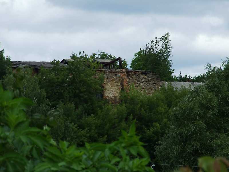 2011 р. Вигляд з півдняРозмір зображення: 800:600 піксел Як пояснив мені Володимир Федотов, оце власне – руїни давньої синагоги. Вигляд з півдня, з греблі на Горині. 26 червня 2011 р. Фото М.І.Жарких. |