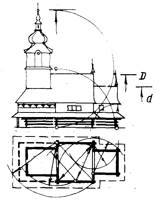 Церква св.Миколи у с. Ізки Міжгірського р-ну Закарпатської обл., 17 ст. Перебудова дахів і вежа 1798 р. План, фасад (с. 226).