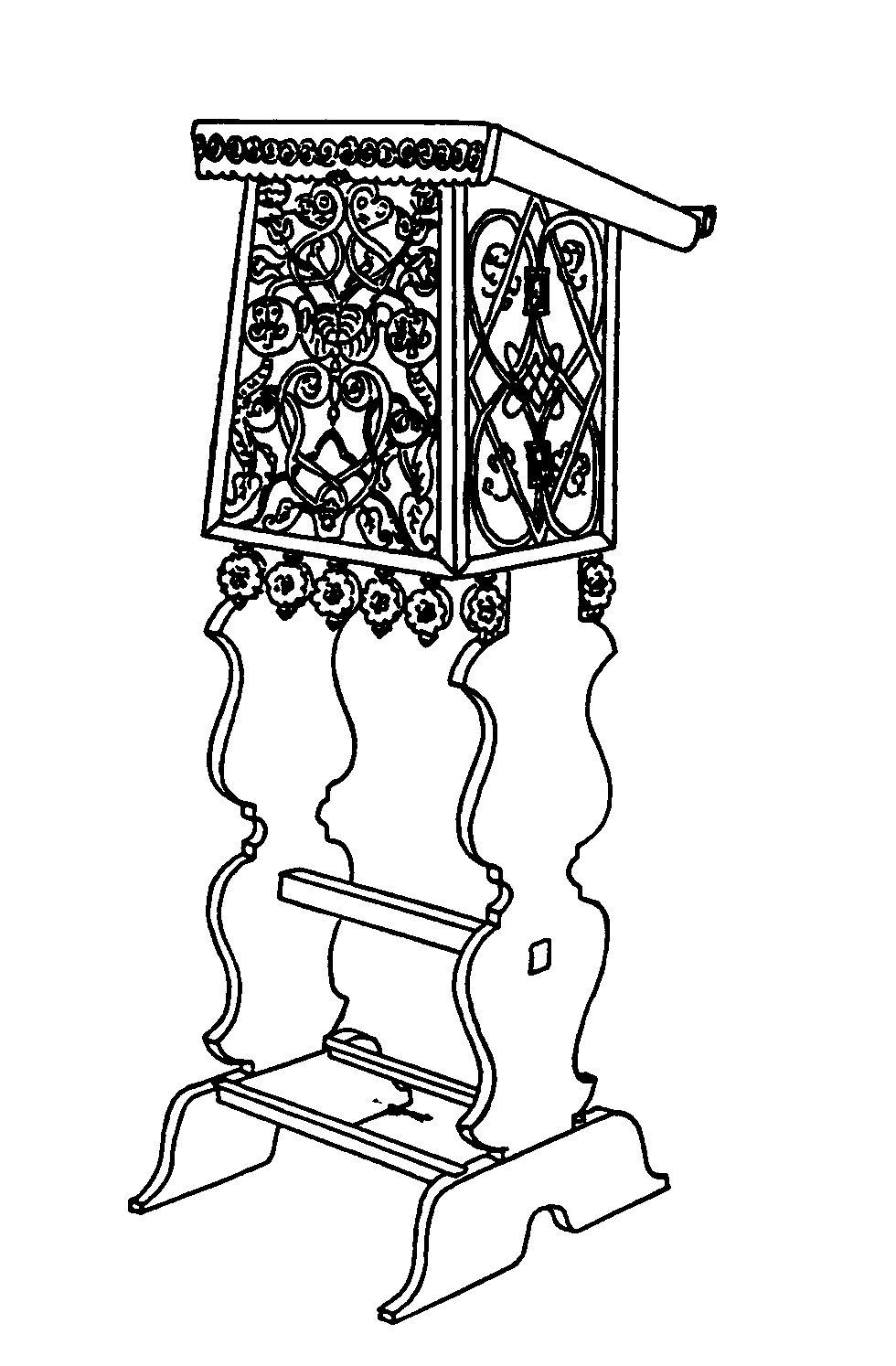 Столик для читанняРозмір зображення: 980:1494 піксел Яблонів (Галичина). Столик для читання із синагоги (lectern). Джерело: Titus D. Hewryk Masterpieces in wood: houses of worship in Ukraine. – New York, 1987, № 158. |