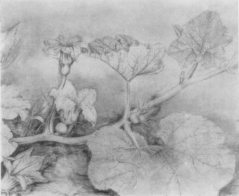 22. Гарбузи цвітуть. 1950-і роки. Папір, олівець. 35: 28 см. Яготинський історичний музей.