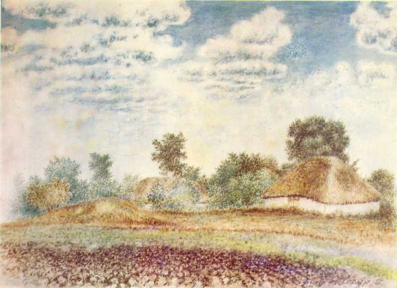 49. За селом. 1956. Папір, акварель. 30: 41 см. Яготинський історичний музей.
