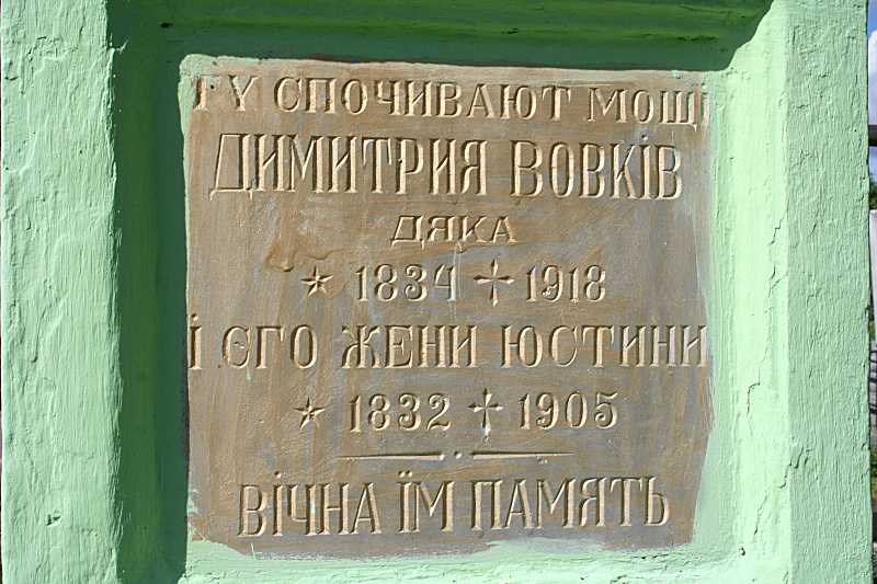 Напи: «Ту спочивают моще Димитрия Вовків дяка (1834 – 1918) і єго жени Юстини (1832 – 1905). Вічна їм пам’ять».