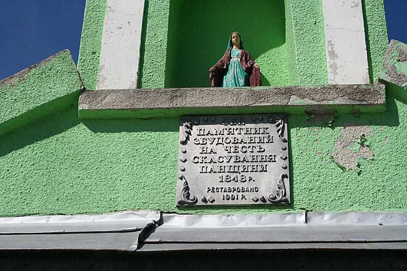 Напис: «Сей пам’ятник збудований на честь скасування панщини 1848 р. Реставровано 1991 р.».