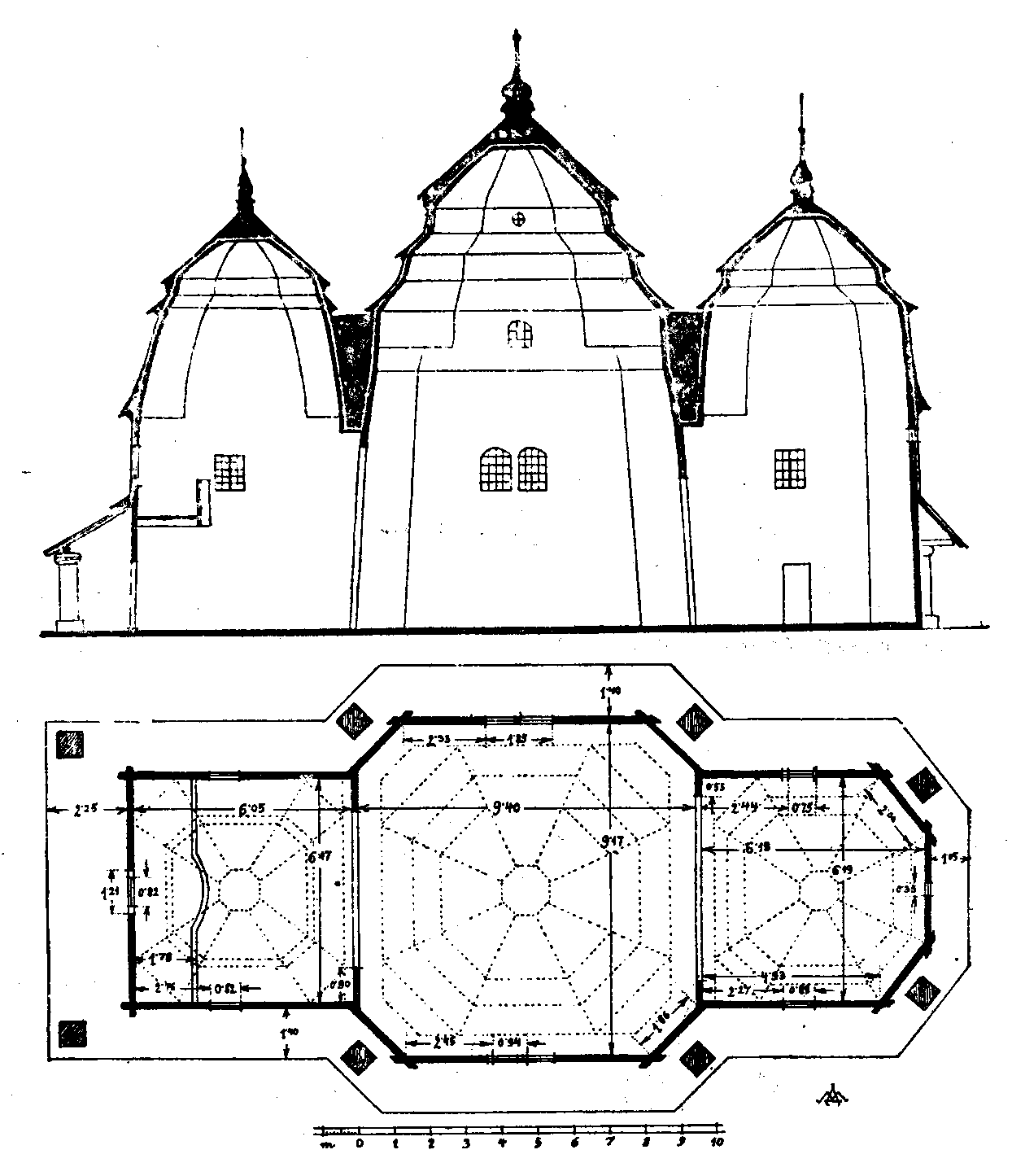 Поздовжній переріз і планРозмір зображення: 1244:1445 піксел Церква 1810 р. (дерев.). Джерело: Драган М. Українські деревляні церкви. – Льв.: 1937 р., т. 2, с. 14. |