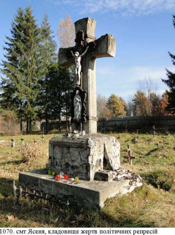Згідно Постанови Військової Ради 4-го Українського фронту № 0034 від 13 листопада 1944 військами НКВС по охороні фронту було затримано й відвезено в трудовий табір м. Сваляви понад 20 тис. мешканців Закарпаття чоловічої статі угорської та німецької національностей. З Ясіня до основного пункту збору ізольованих було вивезено понад 40 угорців. Протягом листопада-грудня 1944 від жахливих умов утримання у Свалявському трудовому таборі – холоду та сльоти, недоїдання і хвороб, непосильної праці загинули тисячі людей, в т. ч. 29 ясінянців, тіла яких були перевезені до Ясіня і поховані на окремому кладовищі. У пам’ять про полеглих односельців на кладовищі в 1944 місцевою громадою було встановлено залізобетонний пам’ятний знак у формі пірамідального двоступеневого обеліска на низькому підмурівку з вмонтованою меморіальною дошкою з іменами 29 загиблих у Свалявському таборі угорців.