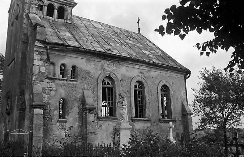 КостелРозмір зображення: 800:517 піксел Костел розташовано на цвинтарі на околиці села, на головній вулиці. Вівтарем він орієнтований на південь, головним фасадом – до вулиці. Спостереження М.І.Жарких, 18.08.1988 р. |
