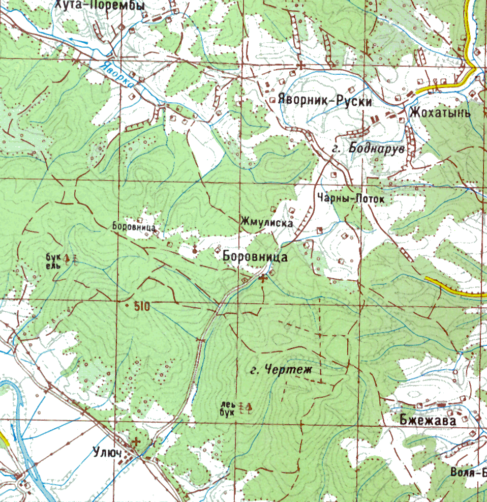 Карта (Яворник-Руски)Розмір зображення: 958:987 піксел Карта Київської військово-картографічної фабрики, масштаб 1:100000, аркуш 88, друк 2000 р. (за матеріалами 2000 р.). |