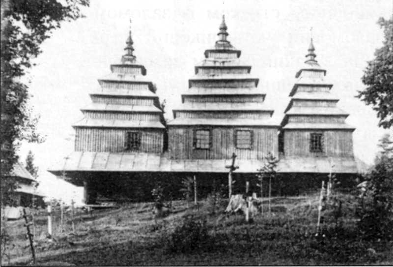Дерев’яна церква бойківського типу, зведена в 1882 році на місці старої, знищеної пожежею. Будівничий – майстер Теодор Сьомбак з Рикова. Споруда складалася з трьох квадратових зрубів, з них зруб нави був ширший. Вінчали її три пірамідальні наметові верхи з чотирма заломами над бабинцем і вівтарем та п’ятьма – над навою. Верх бабинця нависав над західним фасадом. Оперізувало будівлю широке спільне піддашшя, сперте на профільовані випусти вінців зрубів. Згоріла 12 квітня 1962 року.