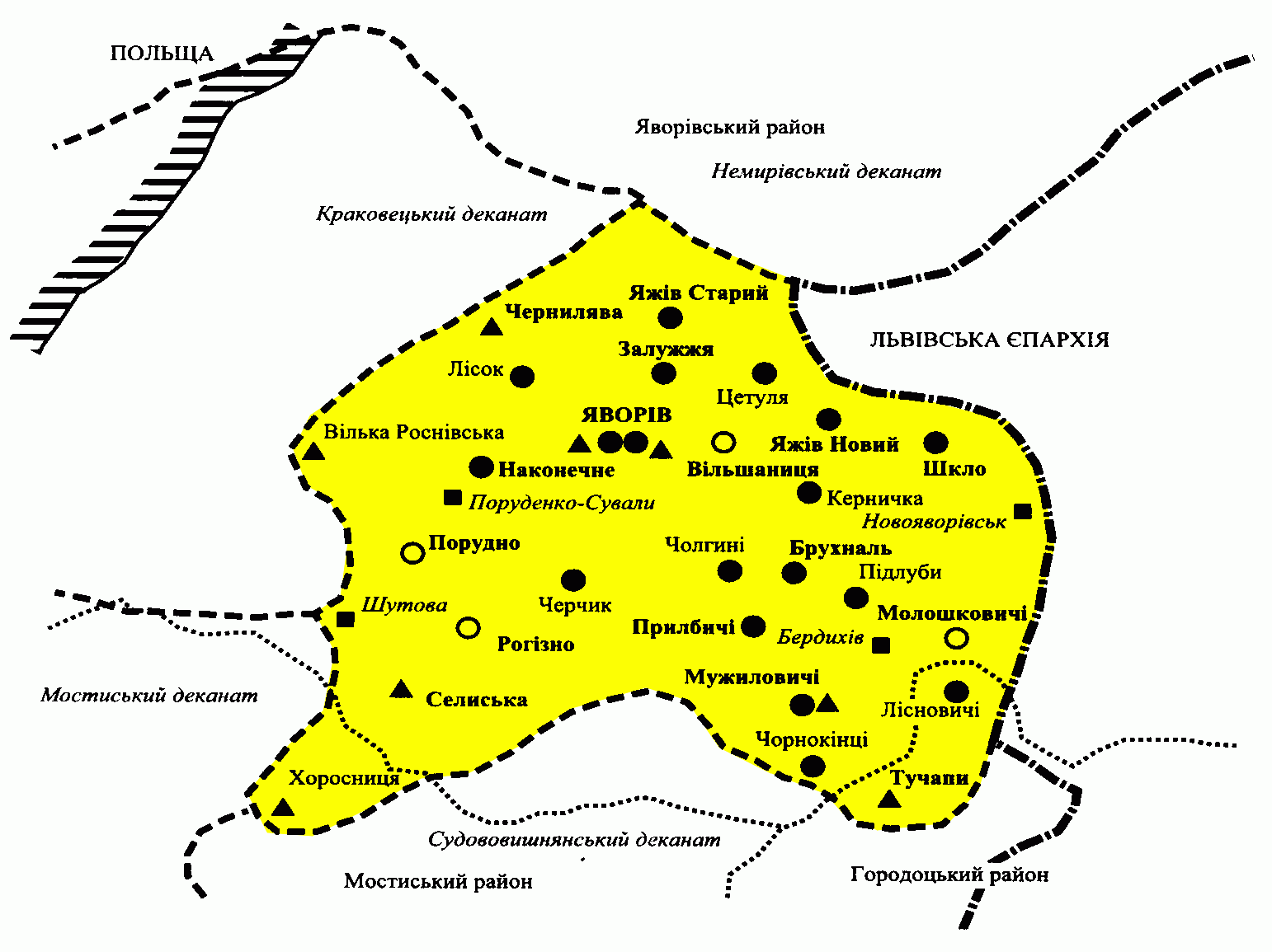 Картосхема деканату за В.СлободяномРозмір зображення: 1542:1155 піксел Джерело: Слободян В. Церкви України: Перемиська єпархія. – Льв.: 1998 р., с. 717. |