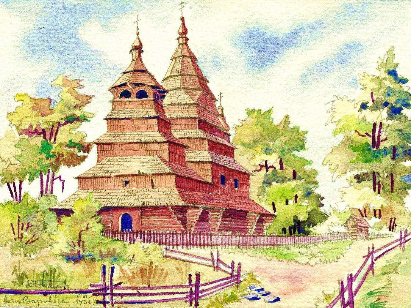 Дерев’яна церква, збудована в 1783 році. Являла собою тризрубну будівлю бойківського типу, яку вінчали три високі верхи. Над навою здіймався верх з двох четвериків і двох восьмериків, покритий восьмибічним стіжком із заломом. Тризаломовий четвериковий верх бабинця з таким самим завершенням мав у горішньому ярусі відкриту голосникову аркаду дзвіниці. Оперізувало споруду широке спільне піддашшя, сперте на випусти вінців зрубів. Згоріла в 1897 році.