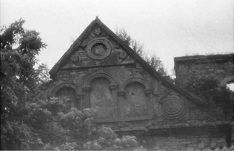 1988 р. Фронтон головного фасаду. Вигляд з позиції С3Розмір зображення: 800:518 піксел 1988 р. 20 червня. Фото М.І.Жарких. Негатека, № 411-18. |