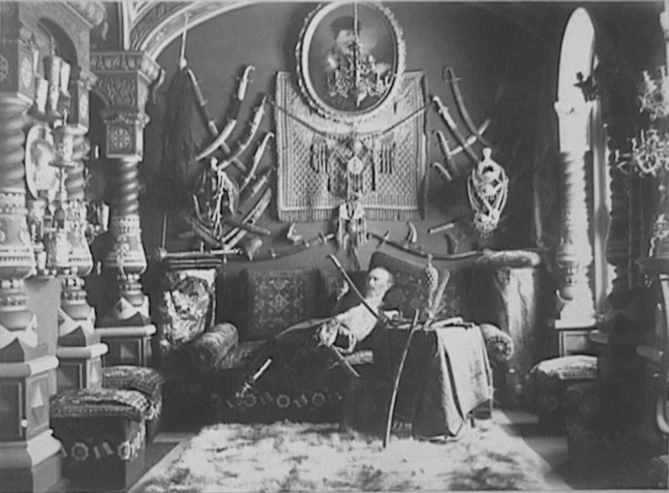 Кабінет-музей Василя Васильовича Тарновського. Сам хазяїн із шаблею Мазепи в руках. Фото Н.К.Бодаревського. Приблизно 1880 рік.