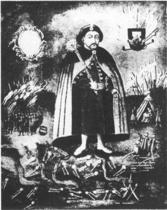 Картина находилась в церкви Чигирина – столицы Богдана Хмельницкого, выполняя функцию ктиторского портрета и эпитафии. Ее замысловатая композиция не имеет аналогий в ктиторских портретах. Сравнить ее можно только с популярными на Украине XVIII – XIX вв. народными картинами, изображающими крупную фигуру запорожца, окруженную миниатюрными фигурками других казаков, ловящих рыбу, готовящих еду на костре, чинящих расправу над врагами, и т.п. Это сходство примечательно: казацкое барокко органически включает фольклорный элемент.