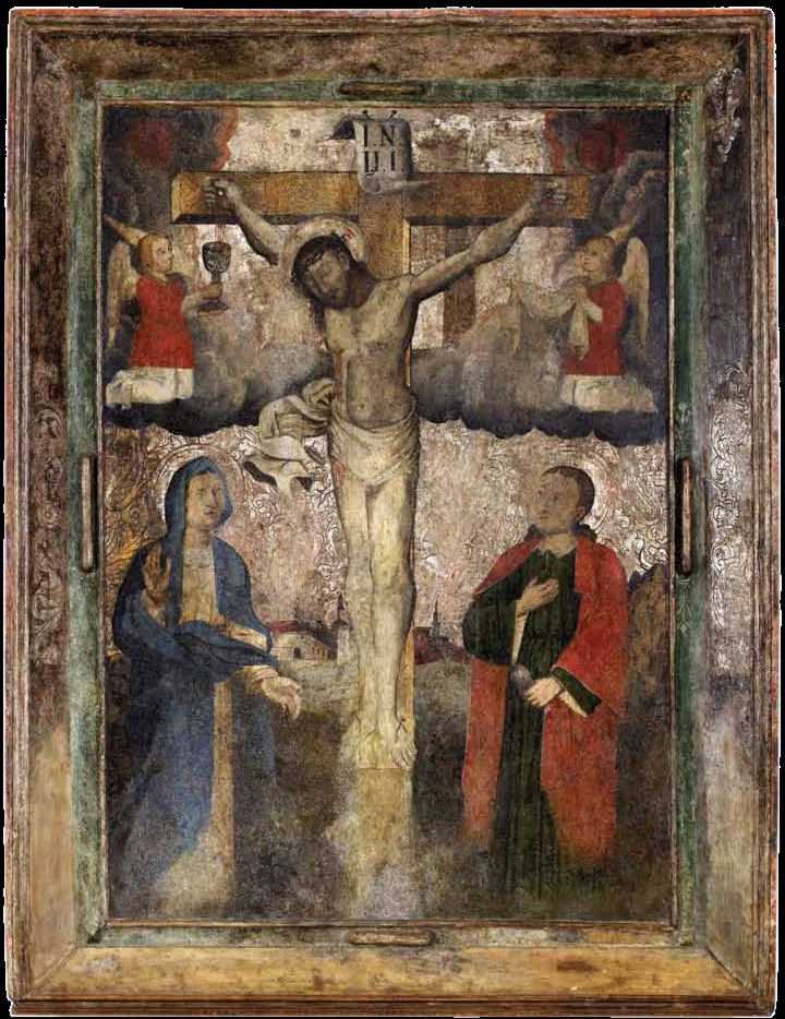 Розп’ятому Христу пристоять Богородиця та Іоанн Богослов у спокійних, здавалось би, позах, лише розведені у сторони руки Богородиці та сльози на її ликові, свідчать про глибоке переживання. Одяг Богородиці прописаний у західноєвропейському варіанті – накинутий на плечі плащ і плат на голові, який покриває розсипане по плечам волосся і відкриває шию.