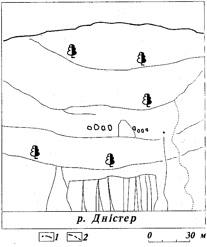 Печерний монастир (схема розміщення по вертикалі)Розмір зображення: 672:800 піксел 1 – джерело води і струмок; 2 – стежка. [Винокур І., Горішній П. Бакота, с. 214, рис. 102).] |