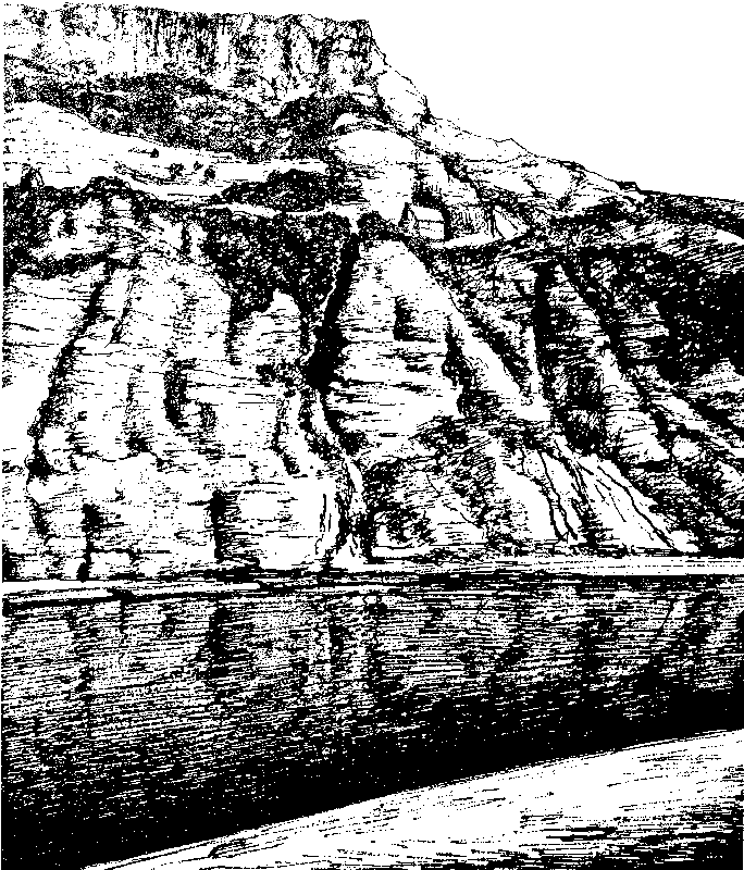 Місце розташування печерного монастиря і прибудованої в 1893 р. дерев’яної церкви. Малюнок С.Нечитайла з фотографії 1950-х років [Винокур І., Горішній П. Бакота, с. 216, рис. 104]