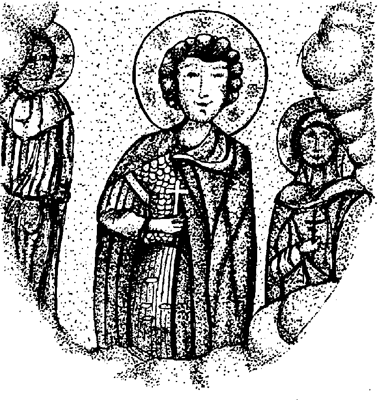 Фрагменти фресок з церкви печерного монастиряРозмір зображення: 759:800 піксел Прориси М.Б.Петрова з фотографій альбома Ю.Й.Сіцинського [Винокур І., Горішній П. Бакота, с. 222, рис. 112.] |