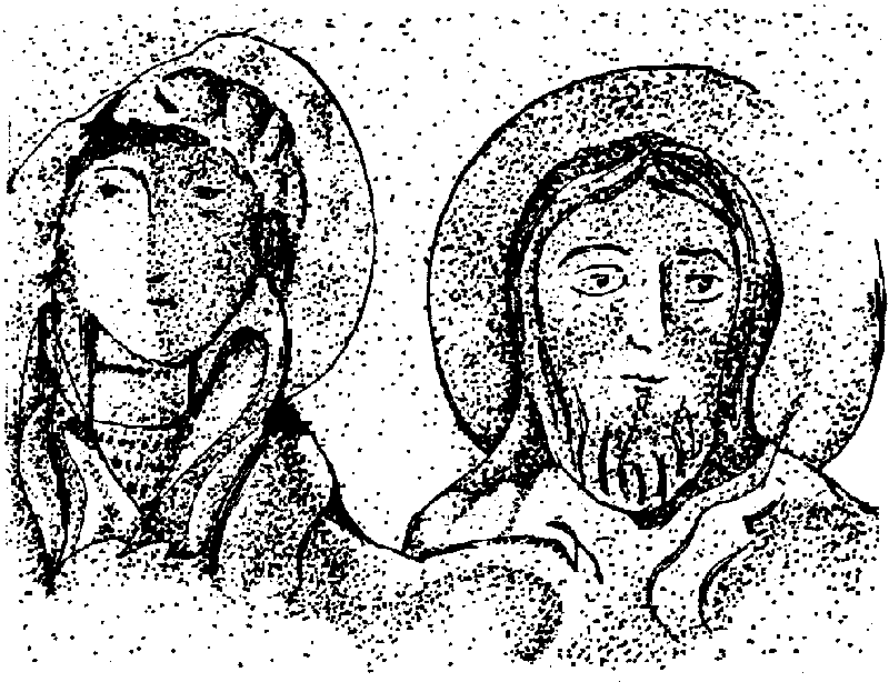 Фрагменти фресок з церкви печерного монастиряРозмір зображення: 800:614 піксел Прориси М.Б.Петрова з фотографій альбома Ю.Й.Сіцинського [Винокур І., Горішній П. Бакота, с. 222, рис. 112.] |
