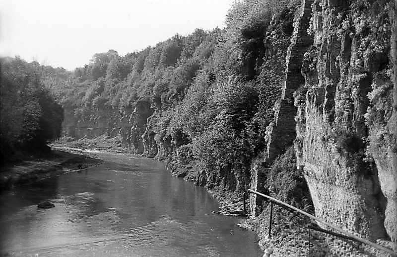 1979 р. Каньйон Смотрича вище містка на Руські фільваркиРозмір зображення: 800:517 піксел 1979 р. 16 травня. Фото М.І.Жарких. Негатека, № 090-15. |