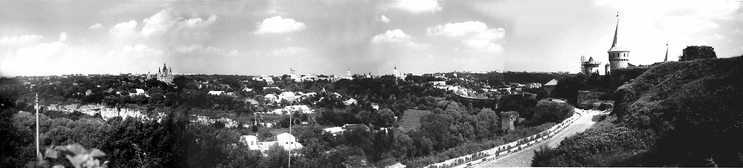 1991 р. Панорама Старого міста з північного заходуРозмір зображення: 2400:545 піксел 1991 р. 24 липня. Фото М.І.Жарких. Негатека, № 708-27+30. |