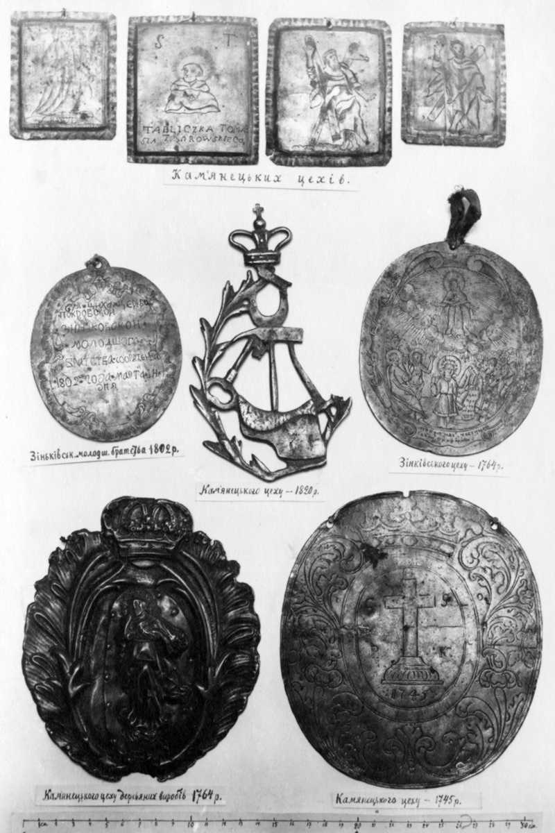 Середній ряд: ліворуч – жетон Зіньківського «молодшого братства» 1802 р. (напис кирилицею: «Сия циха церкви Покровской Зиньковской молодшого братства сооружена 1802 года марта ІН [18?] дня»); в центрі – знак кам’янецького цеху 1820 р.; праворуч – жетон Зіньківського цеху 1764 р. (із зображенням Покрови).