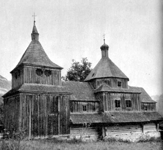 Деревянная Воздвиженская церковь (1799) расположена в урочище Корвасары. В плане она трехчастная и состоит из квадратных срубов: нефа (6,5 х 6,5 м), бабинца и алтаря (оба 4,5 х 4,5 м). Боковые срубы перекрыты низкосрезанными четырехгранными пирамидальными сводами, а средний – восьмигранным верхом без залома, переход к которому осуществлен при помощи плоских парусов. Высота в интерьере до зенита верха 10 м.