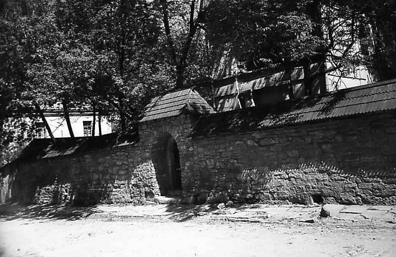 1979 р. Мур та фіртка по вул. Татарській. Вигляд з південного заходуРозмір зображення: 800:519 піксел 1979 р. 16 травня. Фото М.І.Жарких. Негатека, № 096-19. |