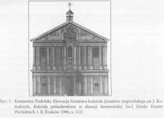 Головний фасад костелу єзуїтівРозмір зображення: 572:411 піксел Джерело: Kamieniec Podolski: studia z dziejów miasta i regionu, Kraków, 2000, t. 1, s. 67. |