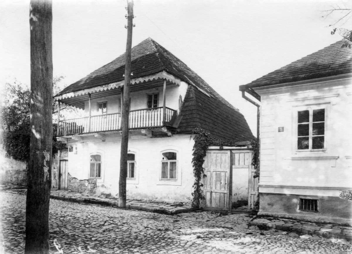 Будинки по вул. Татарській. На будинку праворуч видно номер «8». Виходить, що фото зроблене з північного сходу і номери зростають наліво, отже, будинок із галереєю на другому поверсі мав би бути десятим.