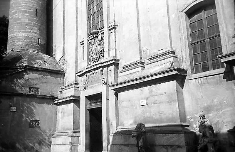 1977 р. Нижня частина головного фасаду. Вигляд з південного заходуРозмір зображення: 800:518 піксел 1977 р. 7 червня. Фото М.І.Жарких. Негатека, № A303-07. |