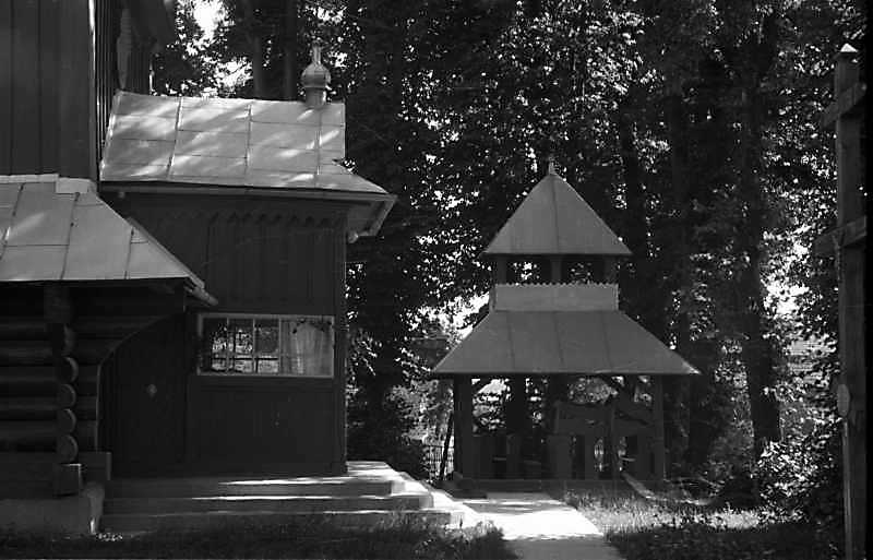 1989 р. Фрагмент церкви і дзвіниця. Вигляд з півночіРозмір зображення: 800:513 піксел 1989 р. 5 липня. Фото М.І.Жарких. Негатека, № 516-24. |