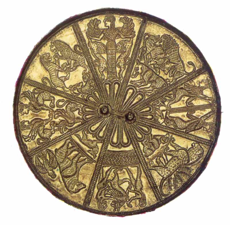Зворотній бік срібного дзеркала; електрові пластини з гравійованими зображеннями крилатої богині, тварин та фантастичних істот.