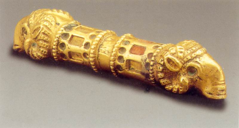 Отлитый из бронзы и обтянутый золотом стержень украшен вставками красного янтаря, закрепленными в углубленных гнездах. На концах стержня объемные головки баранов, трактованные в восточно-греческом стиле. Центральная гладкая часть стержня служила для петли. Изделие принадлежит к небольшой серии парадных колчанных застежек скифского типа.