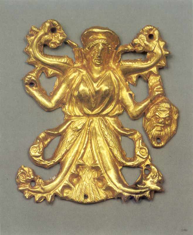 Пластина: змієнога крилата богиня з головою бородатого чоловіка в руці.
