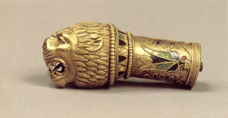 Закінчення гривни у формі голови лева. Ствол прикрашений фризом пальмет та лотосів із синьою та зеленою емаллю.