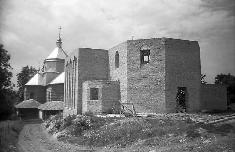 1993 р. Стара і нова церкви. Вигляд з позиції С1Розмір зображення: 800:519 піксел 1993 р. 19 липня. Фото М.І.Жарких. Негатека, № 818-12. |