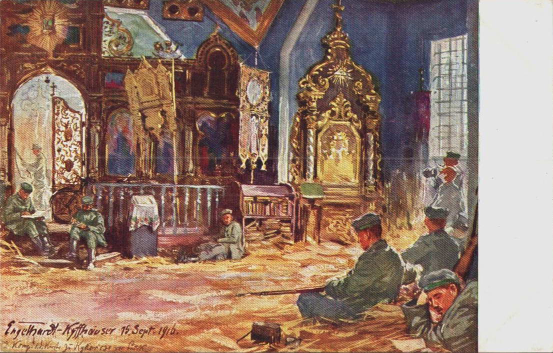 Ця церква була збудована у 1889 році за синодальним проектом. Рисунок, виконаний 15 вересня 1916 року зображає відпочинок другої роти в церкві. Видно іконостас російського характеру, засипану соломою підлогу та солдатів у різних позах.