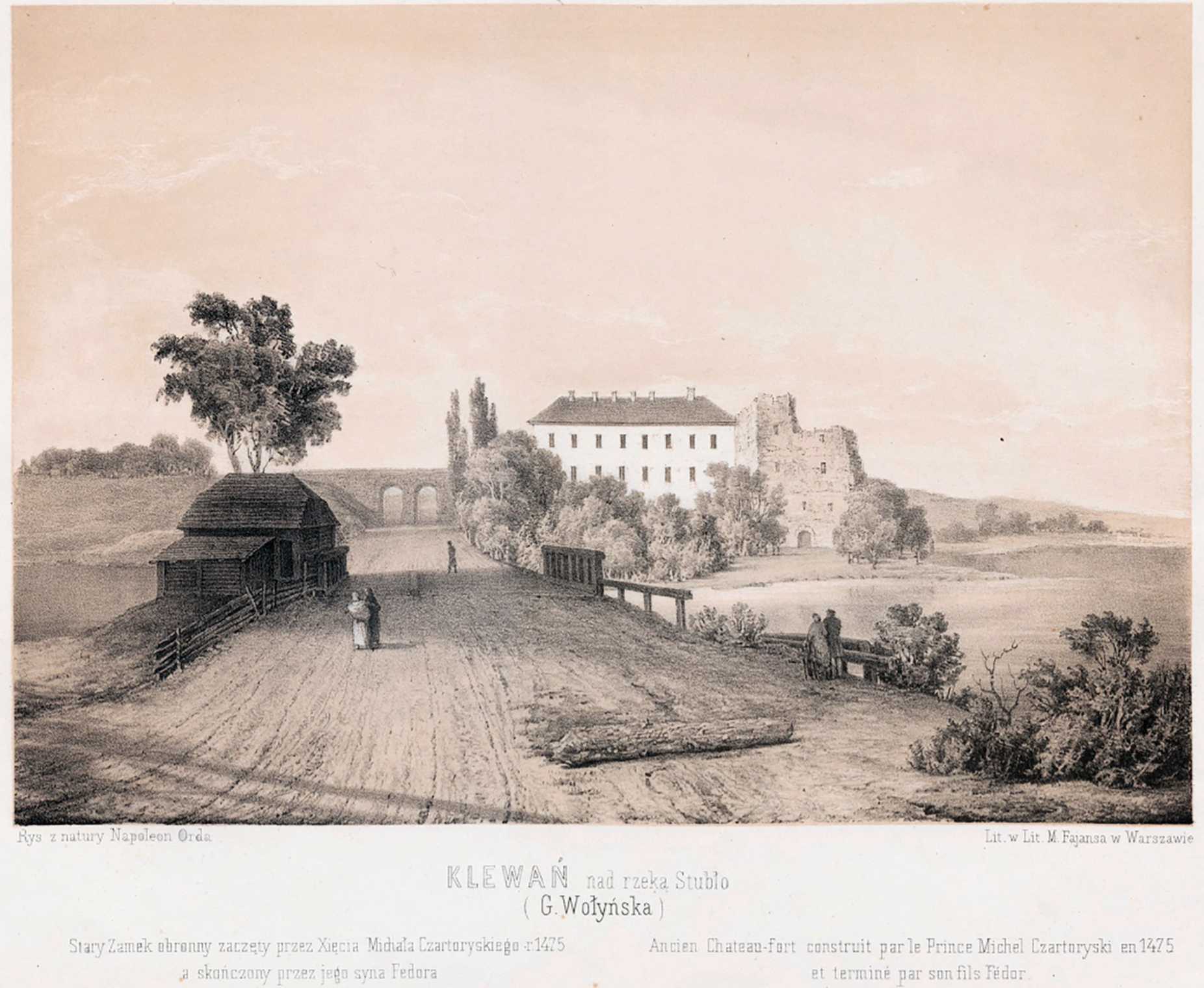 Підпис: «Літографія закладу М. Фаянса у Варшаві з рисунка Наполеона Орди. Клевань над рікою Стублою у Волинській губернії. Оборонний замок, розпочатий кн. Михайлом Чорторийським у 1475 р., а закінчений його сином Федором».