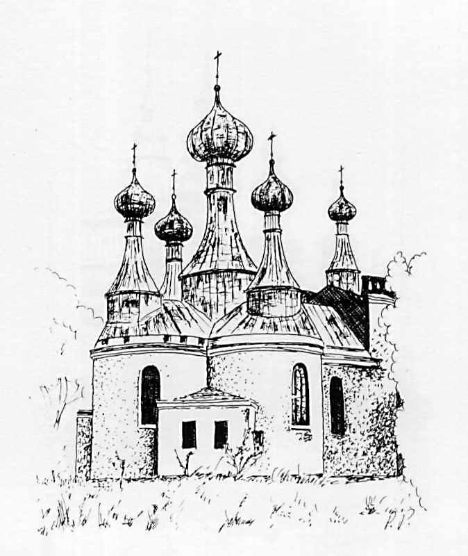 Загальний вигляд з позиції А1Розмір зображення: 674:800 піксел Климківка Успення Пречистої Богородиці 1914 Горлиці Рисунок Р.Раделицького. Церква зруйнована. Джерело: Іванусів О. Церква в руїні. – St. Catharines, 1987, с. 307. |