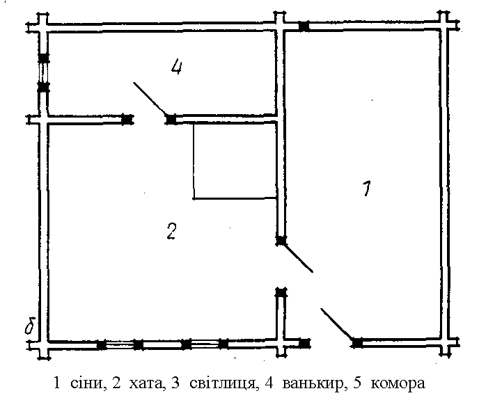 1 – сіни, 2 – хата, 3 – світлиця, 4 – ванькир, 5 – комора.