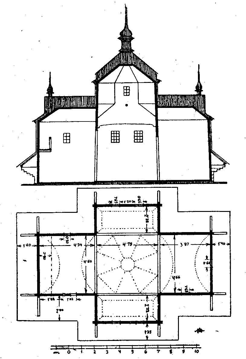 Поздовжній переріз і планРозмір зображення: 814:1191 піксел С. Князівське. Церква 1771 р. (дерев.). Джерело: Драган М. Українські деревляні церкви. – Льв.: 1937 р., т. 2, с. 36. |
