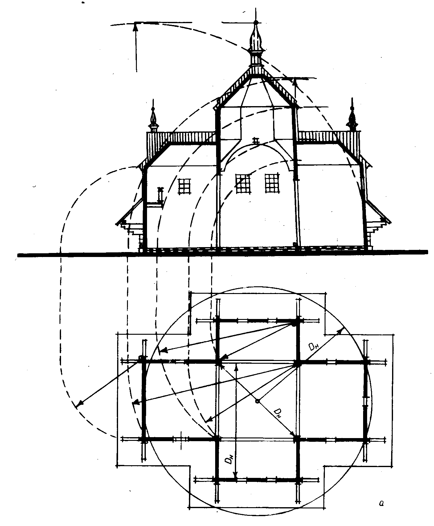 План і розрізРозмір зображення: 1408:1705 піксел Церква у с. Князівка Рожнятівського р-ну Івано-Франківської обл. 1771 р. План і розріз. Джерело: Народна архітектура українських Карпат. – К.: Наукова думка, 1987 р., с. 214. |