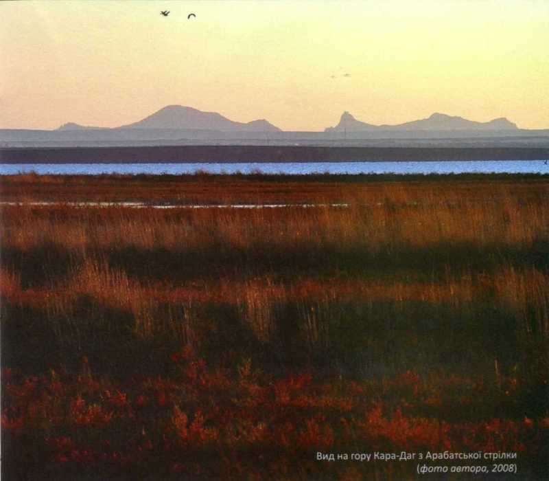 2008 р. Вид на Карадаг з Арабатської стрілкиРозмір зображення: 800:700 піксел Фото О. Гайворонського, 2008 р. [Гайворонський О. Країна Крим. – К.: Майстер книг, 2017 р., c. 279] |
