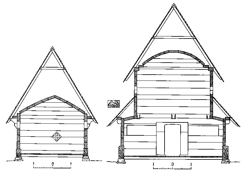 Село Колодное. Никольская церковь, XVII в. Поперечные разрезы алтарного сруба и нефа