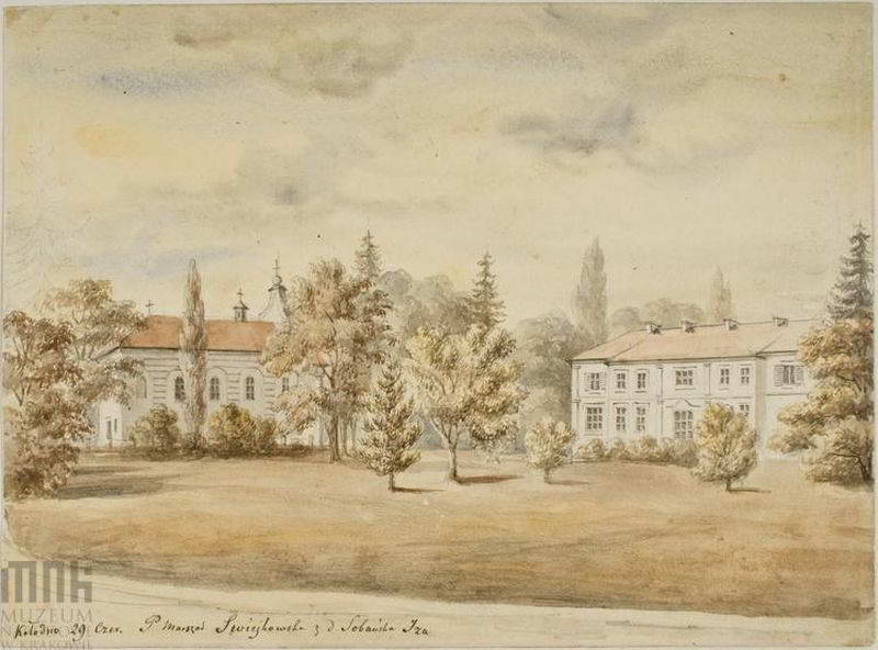 Kościół parafialny p.w. śś. Marcina i Elżbiety i pałac Świeykowskich. Widok od strony ogrodu, Z lewej strony elewacja boczna kościoła; z prawej elewacja ogrodowa pałacu z ryzalitem. 1862 – 1876. Dat.: Kołodno 29 Czerwca Napis: P. Mań… Świeykowska z d. Sobańska Iza; napis na podkładzie: Wołyń. Rys. ołówkiem podmalowany akwarelą, 20,5x27,7. III-r.a. 4174 —odwrocie (Teka Wołyń). [Katalog rysunków architektonicznych ze zbiorów Muzeum narodowego w Krakowie. 1. Rysunki Napoleona Ordy / Opracowały Zofia Kucielska i Zofia Tobiaszowa. – Warszawa: Państwowe wydawnictwo naukowe, 1975, Nr. 323]