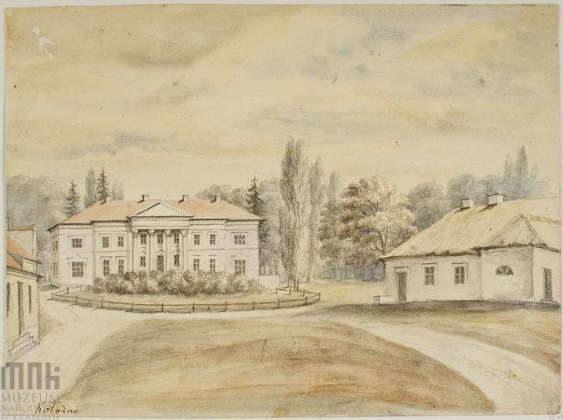 Pałac Świeykowskich. Widok pałacu od strony podjazdu. Pałac dwukondygnacjowy z pozornym ryzalitem i portykiem kolumnowym w wielkim porządku; po obu stronach dziedzińca parterowi oficyny. 1862 – 1876. Napis: Kołodno; napis na podkładzie: Kołodno, Wołyń. Rys. ołówkiem podmalowany akwarelą, 20,5x27,8. III-r.a. 4173 (Teka Wołyń) [Katalog rysunków architektonicznych ze zbiorów Muzeum narodowego w Krakowie. 1. Rysunki Napoleona Ordy / Opracowały Zofia Kucielska i Zofia Tobiaszowa. – Warszawa: Państwowe wydawnictwo naukowe, 1975, Nr. 322]